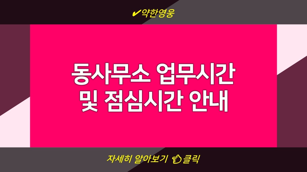 동사무소는 주민들에게 다양한 민원 서비스를 제공하는 곳이야. 그래서 업무 시간과 점심시간이 중요하지. 평일 동안 오전부터 오후까지 특정 시간에만 운영되니까 방문하기 전에 확인하는 게 좋겠어. 보통 오전 9시부터 오후 6시까지 운영되지만, 각 지역별로 조금 다를 수 있으니까 특정 동사무소의 홈페이지를 참고하는 게 가장 좋아. 특히 점심시간은 대부분 12시부터 1시까지라서 그 시간에 가면 안 되니까 주의해야 해. 동사무소의 구체적인 업무시간은 웹사이트에서 더 자세하게 확인할 수 있어. 정확한 정보를 보려면 이곳을 방문해봐 👉 www.gov.kr.