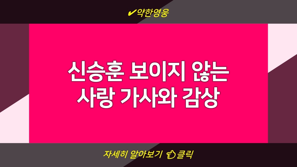 신승훈의 '보이지 않는 사랑'은 사랑의 아픔과 그리움을 담은 감성적인 노래야. 이 곡은 특히 많은 사람들에게 각별한 감정을 전달했지. 가사는 깊은 의미를 갖고 있고, 듣는 이로 하여금 깊은 생각에 잠기게 만들어. 노래를 듣고 싶다면 아래 링크에서 쉽게 감상할 수 있어. 여기에 가사도 있으니 내용을 이해하는 데 도움될 거야. 특히 감정이입하기 좋은 부분들이 많아서 듣는 재미가 쏠쏠하지. 이 곡을 통해 신승훈의 노래 세계를 더욱 깊게 체험해보는 것도 좋을 듯. 링크를 통해 바로 감상해보자.